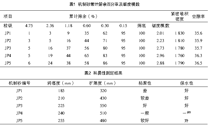 结合图1机制砂级配曲线及表2和易性测定结果分析得出以下结论。