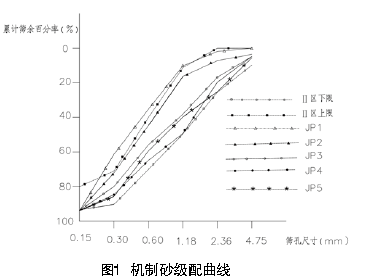 JP2机制砂中,0.15~1.18颗粒占比大,级配曲线形状接近拉伸正S型,级配曲线上部较平,中下部较陡,整体曲线接近Ⅱ区上限,说明砂子仍然偏细,总表面积偏大(略好于JP1)因此,和易性略优于LP1。